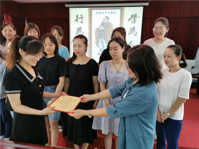 首先,徒弟向导师敬茶。本学期新入伍的9位年青教师,手捧香茗,神色虔诚,恭恭敬敬地擎给自己的导师。导师们面含微笑,欣然饮下,并向“徒弟”们回赠了礼物,寄予了殷殷的期望。