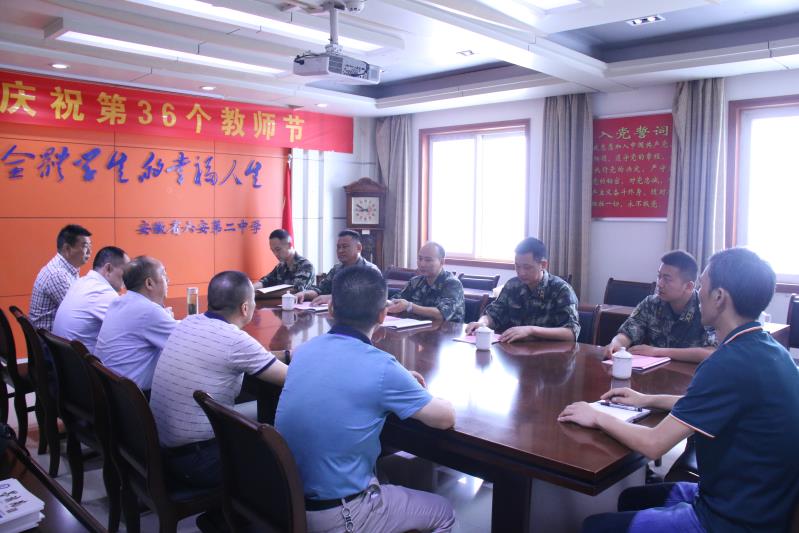 关世宏校长对武警支队领导在教师节来临之际来校慰问,特别是多年来对学校建设发展的关心和支持表示感谢。关校长向支队领导简要介绍了六安二中教育集团三个校区的近期工作情况,强调了学校认真落实立德树人根本任务,始终坚持铸魂育人,坚持培养德智体美劳全面发展的社会主义建设者和接班人。