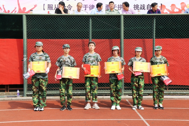汇报表演结束,张伟胜同志宣读在此次国防教育及军训活动中表现突出的高一(2)班等六个优秀班集体名单;王家宗同志宣读在军训过程中获得内务评比优秀的高一(1)班等12个男、女生寝室名单;鲍俊副校长宣读在军训汇报表演中获得一、二、三等奖的六个优秀班级名单;王宇教官宣读100余名优秀学员名单。副校长戴少青、鲍传山,教官王宇及高一年级部有关负责人分别给获奖的班级、寝室和优秀学员颁发了奖状、奖品或奖牌。