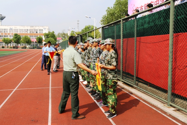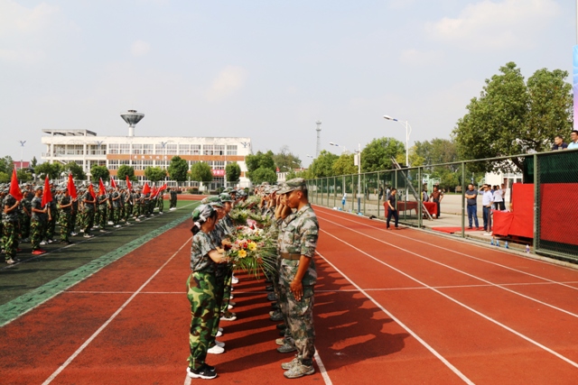 张伟胜同志代表学校向六安市青少年国防教育服务中心教官王宇同志赠送了锦旗,各班学生代表向25名军训教官敬献了鲜花。
