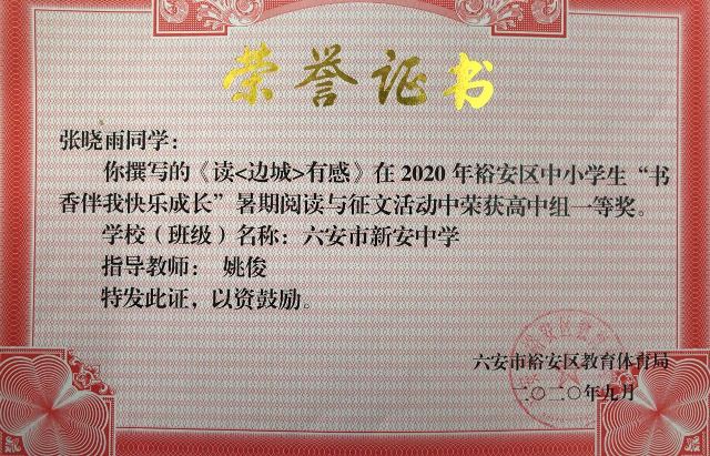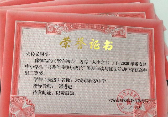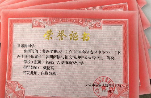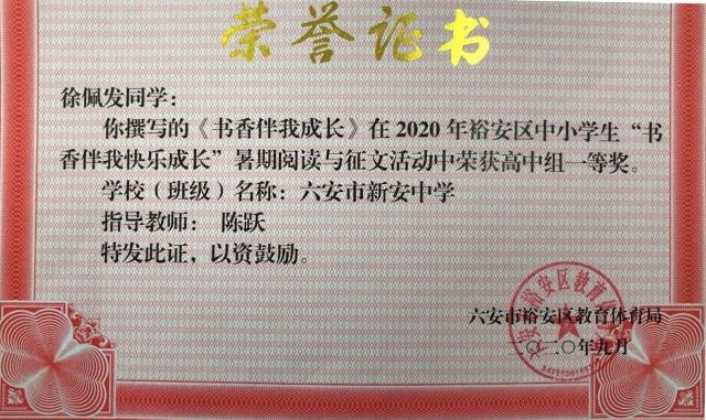 新安中学学生参加裕安区组织的“书香伴我快乐成长”阅读与征文评比中取得佳绩