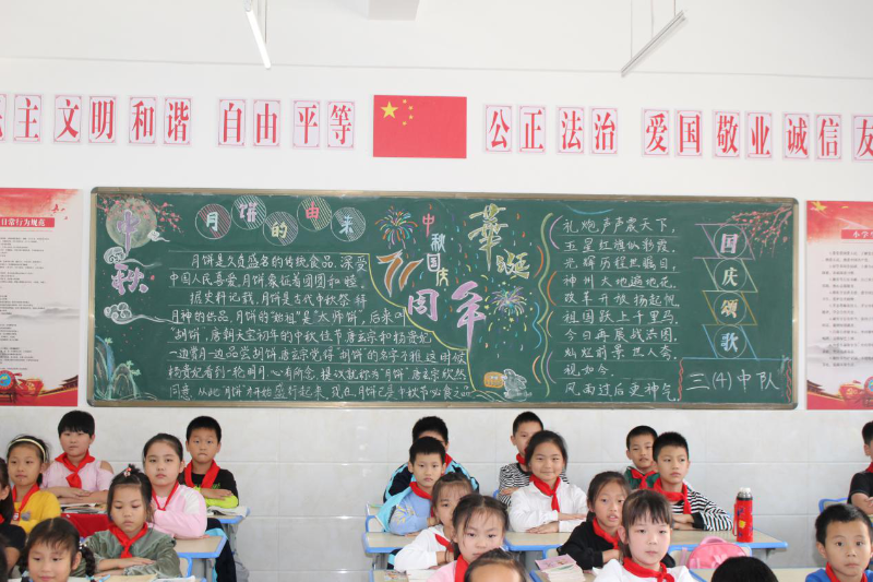 9月30日下午,毛中附校开展了以“庆中秋、迎国庆”为主题的黑板报评比活动。此次活动是为迎接中秋、国庆双节的到来,进一步让学生继承和发扬祖国的传统文化,丰富校园文化内涵,激发爱国主义情感。