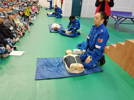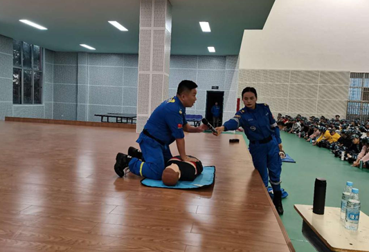 之后,陶队长又生动的讲解了创伤包扎、心肺复苏术等急救技术并现场演示。