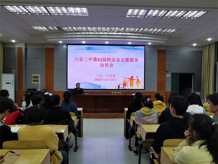 六安二中第52届校运动会于2020年10月27日举行,为保证运动会期间志愿服务工作的顺利开展,10月26日下午,校团委在博学楼二楼阶梯教室召开六安二中第52届校运动会志愿服务动员会。校团委委员、全体学生会成员和全体广播员参加此次会议。本次会议由校团委副书记常青主持。
