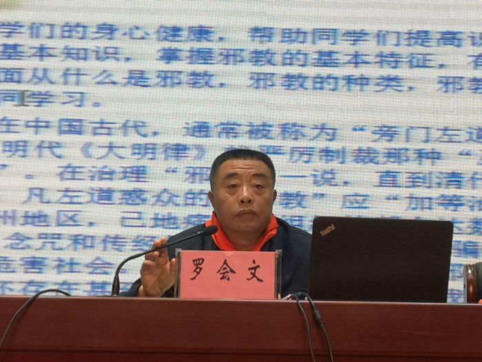 接着,罗会文副主任为大家做“反对邪教 崇尚科学”知识讲座。罗主任利用故事、图片、儿歌等孩子们喜闻乐见的形式,宣讲了什么是邪教、邪教的危害和如何抵制邪教。罗主任讲得绘声绘色,同学们听得津津有味。最后,参会学生代表纷纷走上讲台在“共同抵制邪教 共享文明健康”的条幅上签名立志。