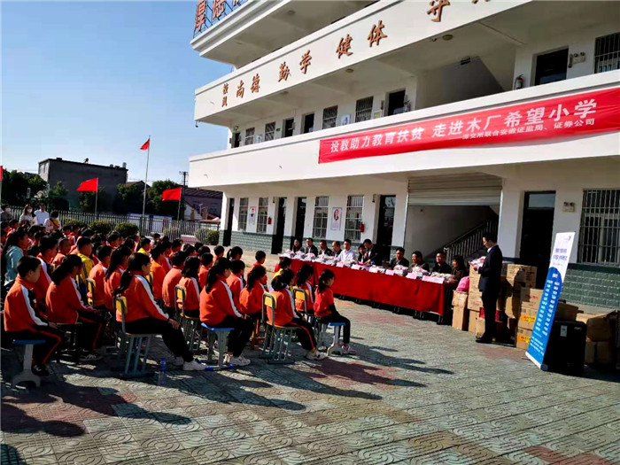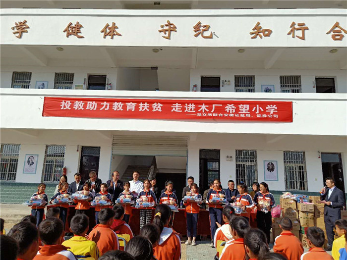 扶贫济困,爱心助学,传递的是爱心,营造的是希望。11月6日下午,在金安区木厂希望小学隆重举行了“投教助力教育扶贫 走进木厂希望小学”捐赠仪式,深交所及各证券公司的爱心人士、木厂镇党委副书记陆明鹏、木厂镇中心学校校长吴裕出席了此次活动。