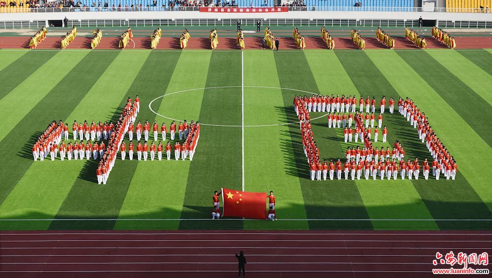 接下来,孩子们向全县人民展示了第三套广播体操《七彩阳光》,他们整齐划一、流畅优美的韵律操展演,充满活力的形象,充分体现新时代小学生的团结、奋发、向上的精神面貌。韵律操展演一结束,实验小学可爱的孩子们用他们气势磅礴的队伍排列出“中国”二字,红色上衣、白色裤子形成的“中国”二字,立体感特别强,视觉震撼。随后,孩子们齐声高呼主题紧扣时代脉搏的“强身健体,活力舒城。盛世全运,筑梦中国!”口号,为舒城县全民运动会加油助威,气场强大,全场观众响起了经久不息的掌声。