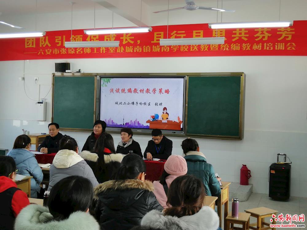 十二月的六安,已是寒冬时节,寒意袭人,但城南学校的校园内,却暖意融融。来自城南镇各个学校的五十多位热爱小语的老师齐聚一堂,共同享受了一道精神大餐。来自工作室的施光宏和张玉两名老师先后为大家献上了两节精彩纷呈的语文示范课。接着施光宏和张校长就统编教材的使用,分别从不同的角度进行了培训指导。