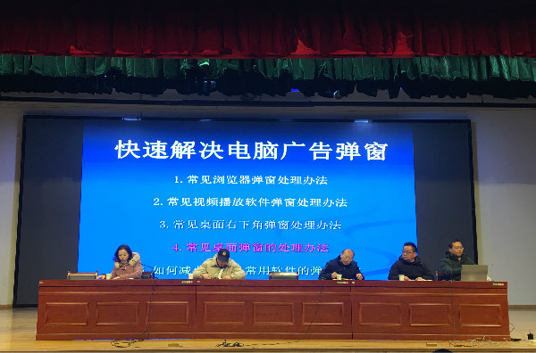 为此,该校1月6日下午,利用教职工例会的机会,由信息中心何坤主任交流经验,教授如何快速解决电脑广告弹窗问题。何主任使用幻灯片,从四个方面具体讲解了处理弹窗的办法:常见浏览器弹窗处理办法,常见视频播放软件弹窗处理办法,常见桌面右下角弹窗处理办法,常见桌面弹窗处理办法。步骤清晰,浅显易懂,语言幽默。