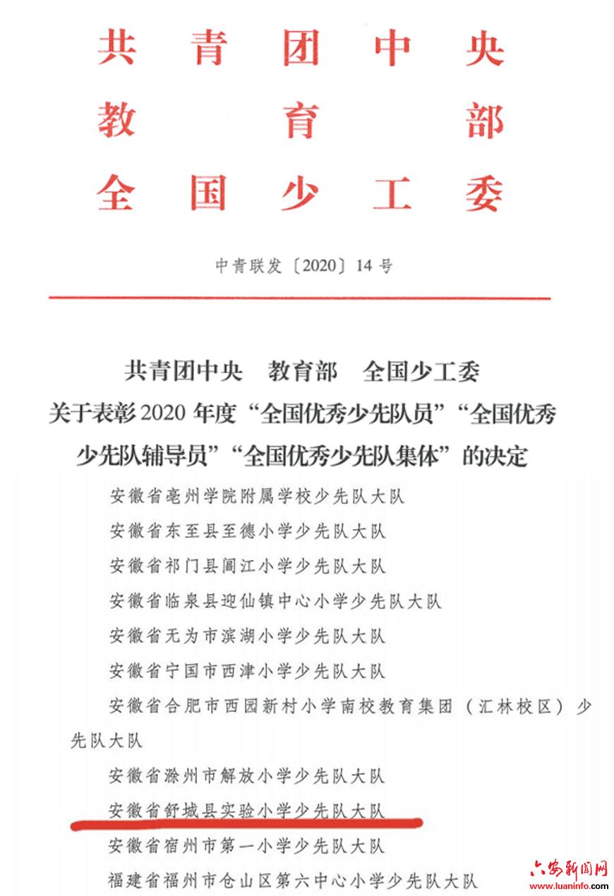 近日,共青团中央、教育部、全国少工委对2020年度“全国优秀少先队员”“全国优秀少修队辅导员”“全国优秀少先队集体”进行表彰,舒城县实验小学少先队荣获“全国优秀少先队集体”称号。