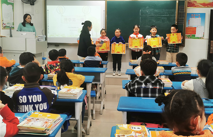 早上,校长和值班老师们早早来到校门口,迎接报到的学生,经过体温检测通道后,孩子们陆续走进校园,来到班级,老师们已在教室等候。检查作业、发放教材、常规教育、开学第一课……各班开学报到井然有序、有条不紊。