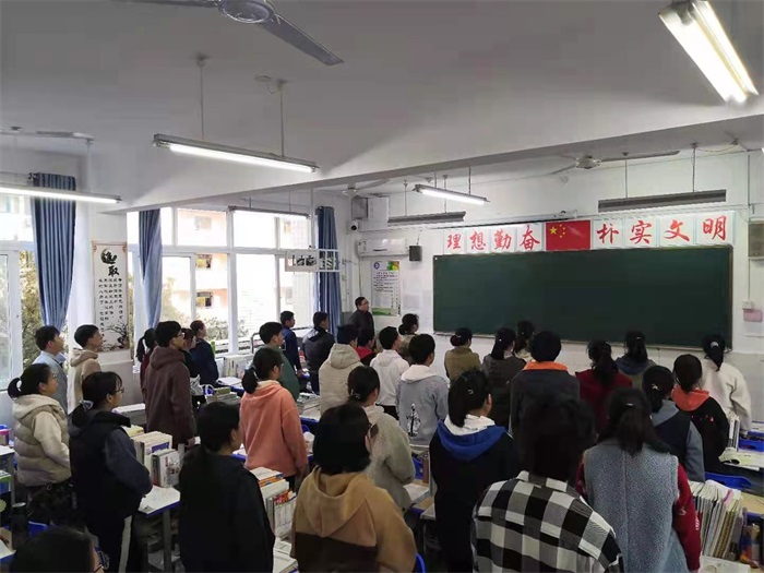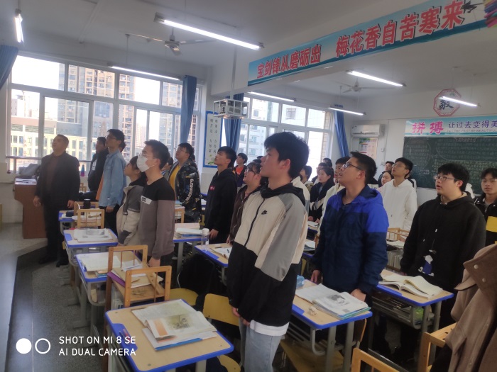 伴着广播中主持人的开场语,全体学生起立,面朝教室内黑板上方鲜艳的五星红旗,行注目礼。和着激昂的旋律,高唱国歌,表达对伟大祖国的热爱和赞美。