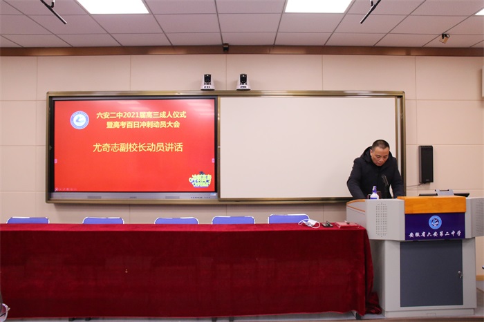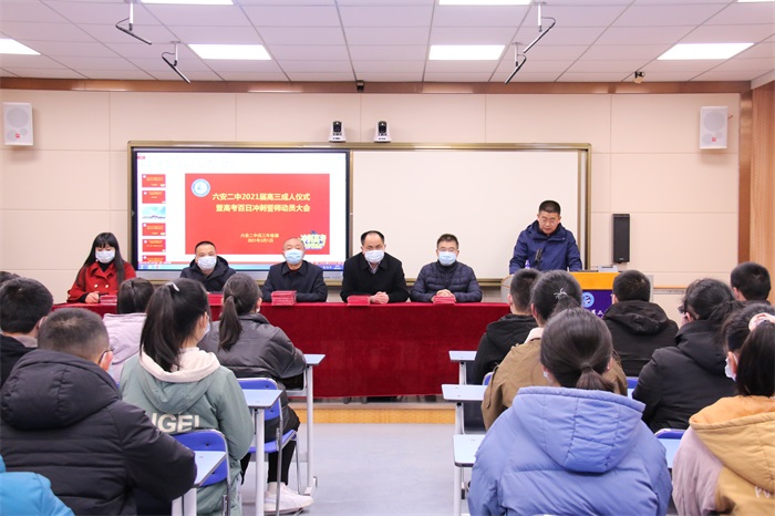 十年磨剑酬壮志,百日拼搏铸辉煌。3月1日下午,六安二中举行高三年级成人仪式暨百日冲刺动员大会。党委书记、校长关世宏,党委委员、副校长李守宏、尤奇志、罗会武,优秀家长代表和一千五百名高三同学参加了会议。大会分为主会场与分会场,各班学生代表在录播教室主会场,其他同学在各班分会场同步观看。高三年级部主任闫俊主持会议。