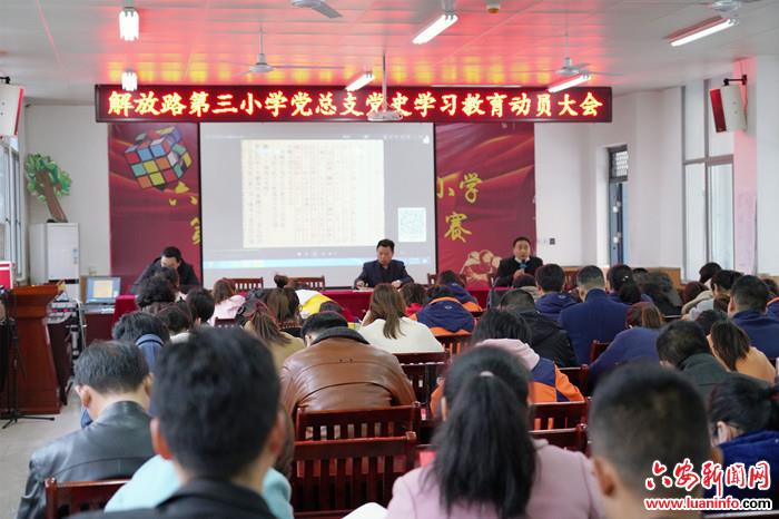 3月15日,解放路第三小学党总支召开党史学习教育动员大会,对学校今后开展党史学习教育进行动员和具体工作部署。号召全校教师重温初心使命,坚定理想信念,提升师德师能,从党史教育活动中汲取奋进的力量。