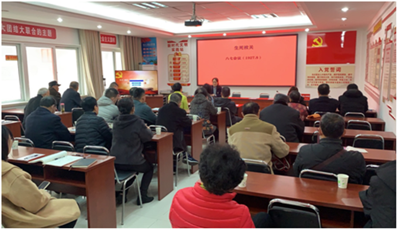 范大美老师从开天辟地中共建立,生死攸关八七会议,伟大转折遵义会议,民族大义瓦窑堡会议、洛川会议,明确方向中共七大,远见卓识七届二中全会等中共党史重大会议着手,客观真实地讲述了那段可歌可泣的历史。范老师语言平和亲切,讲述详细精彩、深入浅出。最后播放的党史剪辑视频《有点甜》,形象生动地让社区党员了解中共党史。范老师本次娓娓道来、绘声绘色地的宣讲,让社区党员全面客观地了解了中国共产党披荆斩棘、奋斗拼搏的艰辛过程。最后社区领导高度肯定范老师的宣讲,感谢兄弟组织的帮助。