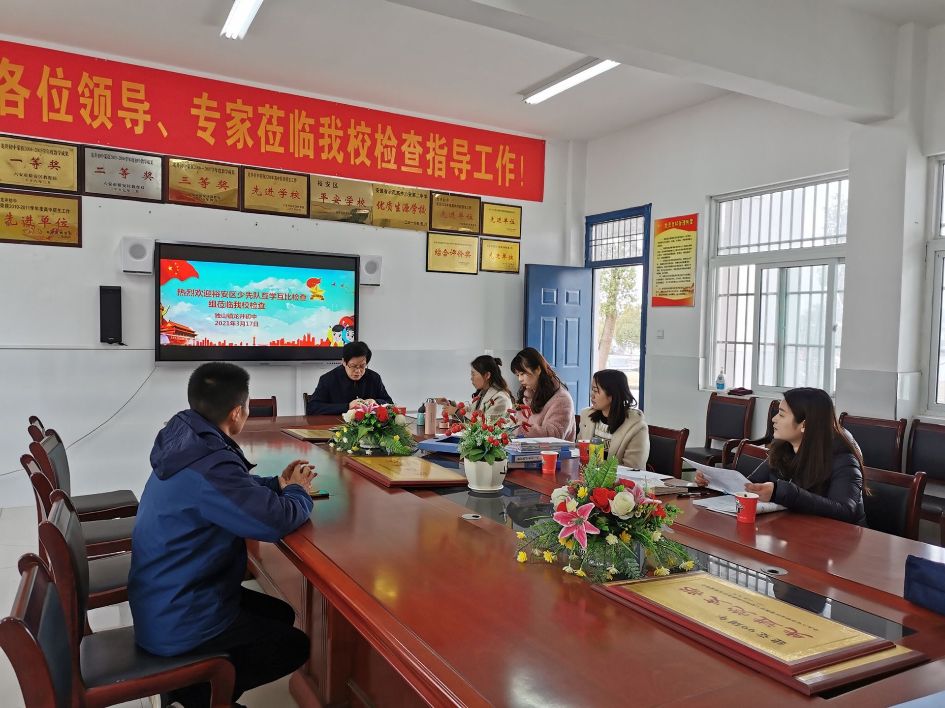 互学互比一行先后来到独山镇中心小学、独山镇龙井初中、分路口镇中心小学、分路口初中、六安市城北小学西校区,实地查看学校少先队阵地建设和活动开展情况。