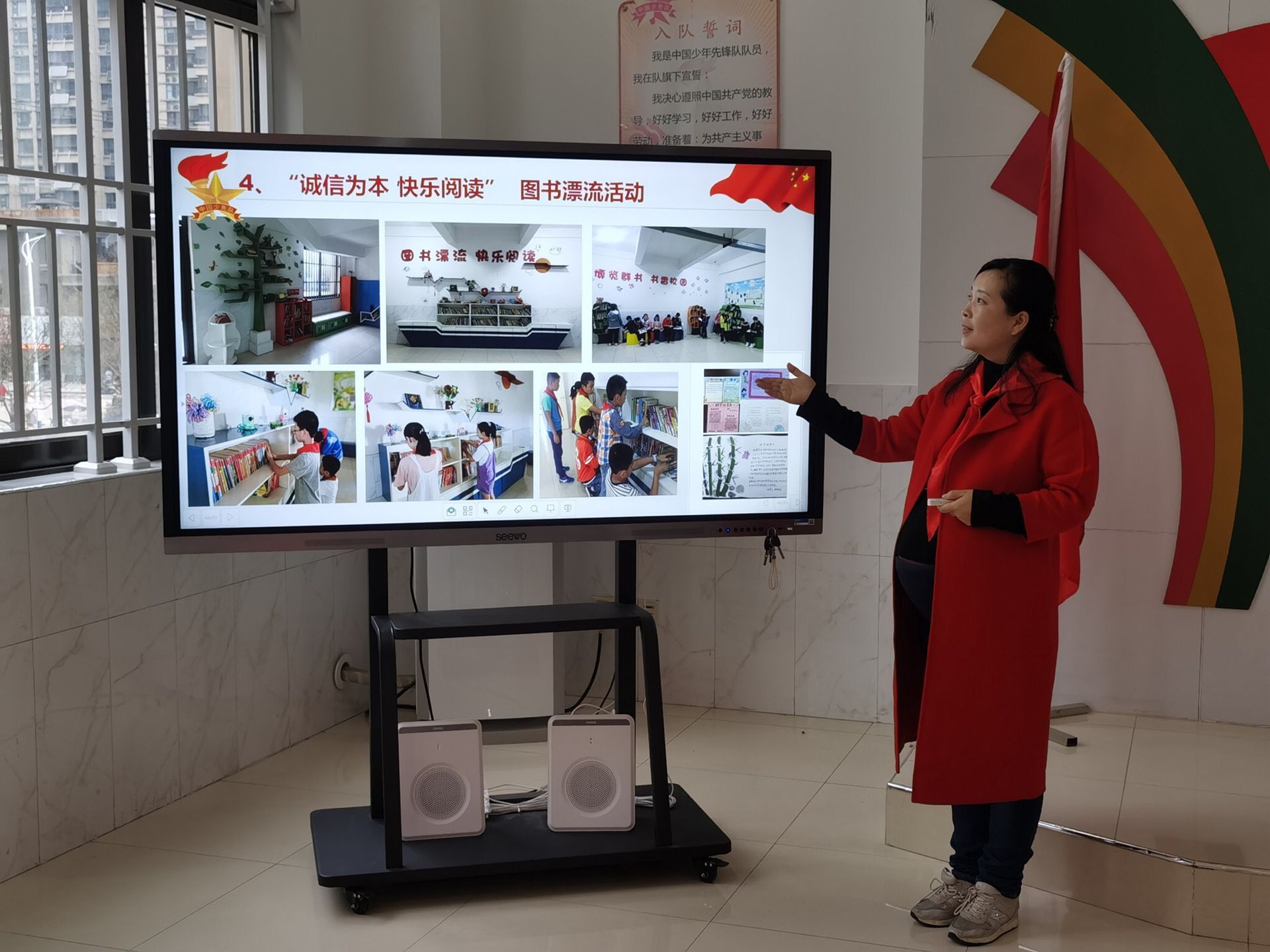 下午三点,众人来到此行终点站六安市城北小学西校区。首先聆听了大队辅导员马晏茹老师对学校少先队活动的工作汇报,马大队利用PPT声色并茂地展示了城北小学西校区的少先队活动的风采与成果,从基础的组织与阵地建设,到“书香校园”“红领巾社团”等重点活动的开展,再到“传承经典诵中秋”“节约粮食见行动”等特色活动的组织,深入浅出,娓娓道来……一幅宏大且靓丽的学校少先队工作的风景图跃然眼前。