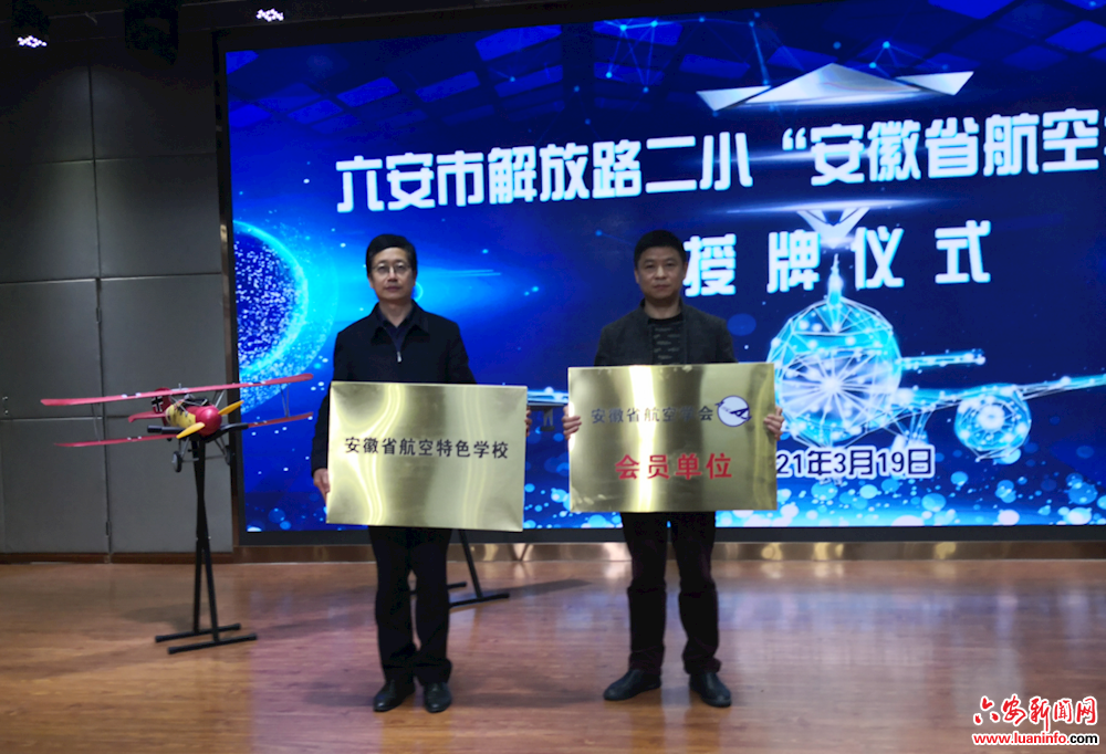 本网讯 3月19日上午,我市解放路第二小学“安徽省航空特色学校”授牌仪式在该校报告厅举行。安徽省航空学会会长段泽明向解放路第二小学授牌,同时向该校成为首个“安徽省航空特色学校”,并加入安徽省航空学会表示祝贺。