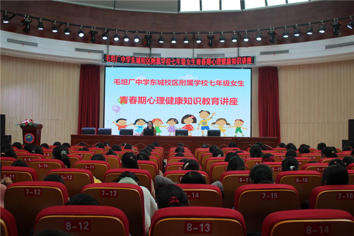 开展七年级女生青春期心理健康知识讲座。七年级全体女生在圆楼多功能报告厅参加由校团委组织的青春期心理健康知识讲座。此次讲座是为了加强我校未成年人心理健康教育,增强其自我保护意识,让正处于青春期的女生正确认识青春期,恰当处理青春期遇到的一些苦恼,帮助她们平安快乐地度过青春期。