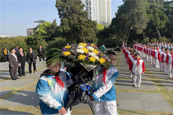 春风缕缕,阳光和煦。少先队员们怀着爱国之心庄严地唱完国歌。随即,四名优秀的学生代表向庄严的烈士纪念碑敬献花篮。该校小学部许雯副校长、校少先队大队辅导员陈昌玉老师共同上前,为花篮整理挽联,并带领全体师生静立默哀一分钟,哀悼革命先烈,深切缅怀英勇献身、舍生取义的民族英雄们!