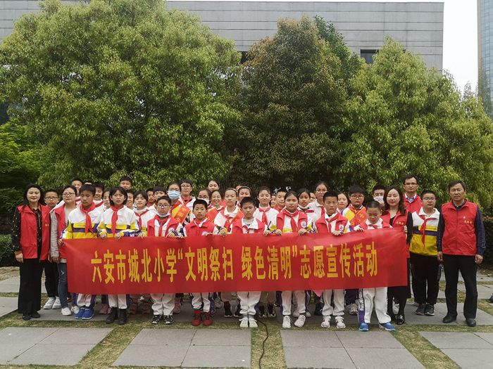 为弘扬优良传统,大力倡导文明、环保、绿色祭扫新风,六安市城北小学红领巾志愿者在党员教师志愿者的带领下,走向街头,走进地下商业街,来到皖西革命烈士陵园……向广大市民发放《文明祭扫 绿色清明》倡议书。