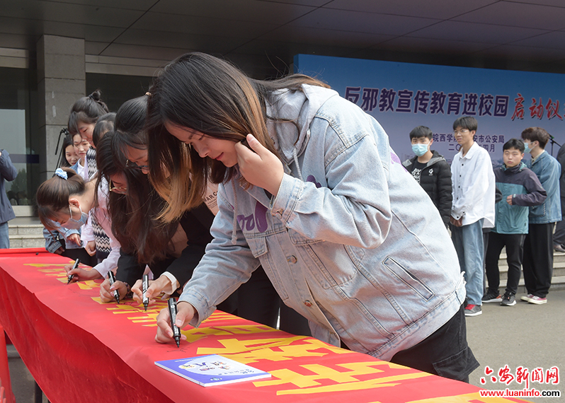 在启动仪式现场,市公安局联合皖西学院引导大学生关注“中国反邪教”微信公众号。反邪教承诺签名台前,大学生们在“反邪教”宣传横幅上郑重地签下自己的名字,以表达自己抵制邪教的坚定决心。活动中,民警还通过发放反邪教宣传资料、张贴海报、接受咨询和现场讲解等形式大力宣传反邪教内容,引导广大师生远离邪教,自觉抵制邪教,树立正确的人生观、价值观。同时,鼓励广大师生发现邪教组织违法活动及时拨打110报警。