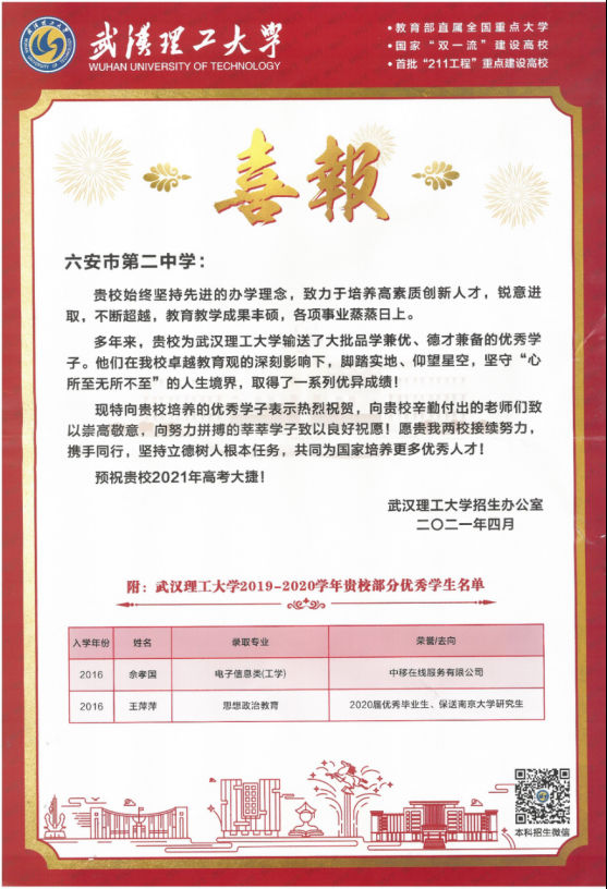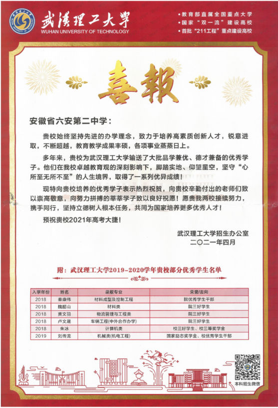 武汉理工大学向六安二中发来喜报 编辑:汤晓雪 来源:六安二中 浏览次数: 次 发布时间:2021-05-12 10:21:01 【字体:小 大】 扫一扫在手机打开当前页 【打印正文】 上一篇:爱劳动,知荣辱——六安一中开展劳动教育主题活动 [ 2021-05-12 ] 下一篇:2021年春学期国旗下讲话(九)——防震减灾 警钟长鸣 [ 2021-05-12 ]