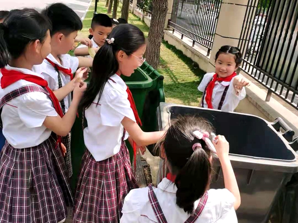 垃圾分类。“这个是可回收垃圾”“这个是不可回收垃圾”“这个是有害垃圾”……孩子们不断地分拣投送,时而讨论,时而欢笑。通过亲身实践,同学们既巩固了垃圾分类的常识,又增强了垃圾分类的投放意识。