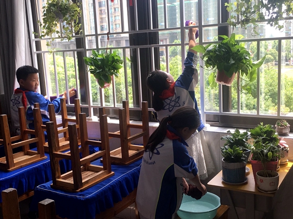 校园绿化。从班级盆栽的绿萝、多肉、吊兰,到校园一隅的大树、草坪、花坛……同学们争前恐后地用自己的小手呵护它们,或浇水、或施肥、或修剪,片刻之后,它们更显得绿意盎然,生机勃勃。