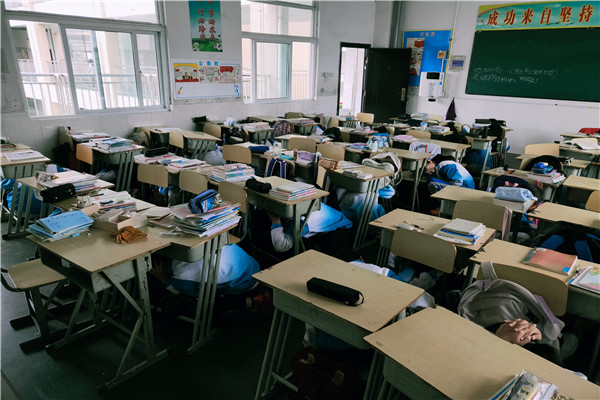 随着第一声警报长鸣,同学们在老师的指挥下,迅速就近躲避在课桌下,并用双臂或其它柔软物品保护好头部,做好个人防护。安全保卫组人员迅速进入紧急状态,做好学生疏散准备工作,其他应急组也迅速赶到演练现场做好救援准备工作。