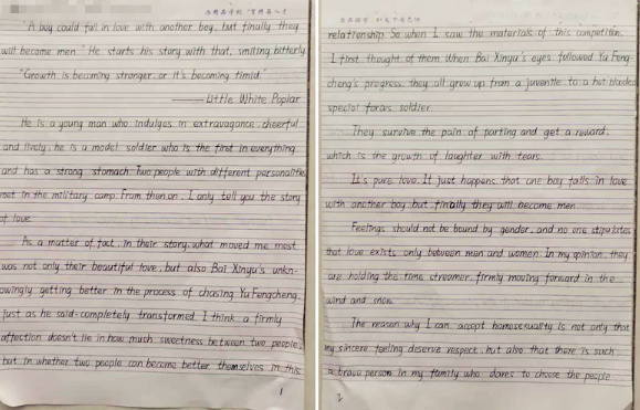 刘玉柱同学用朴实的笔触叙述着与朋友的故事,跌宕起伏的情节、真挚的情感、圆满的结局,这篇作品正如他们的友谊般熠熠生辉。