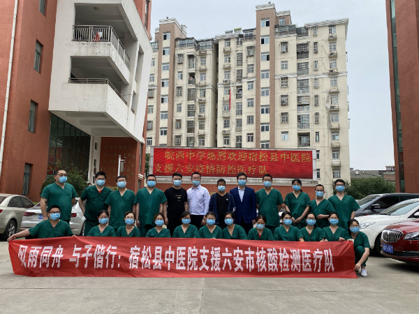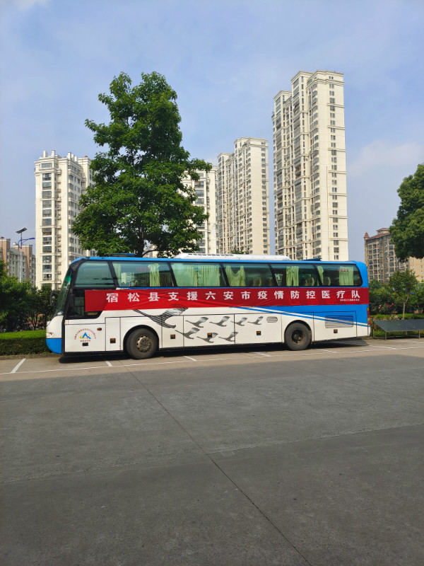 2021年5月18日上午,一辆大巴缓缓驶入皖西中学主干道,上面 “宿松县支援六安市疫情防控医疗队”的横幅,鲜艳夺目。