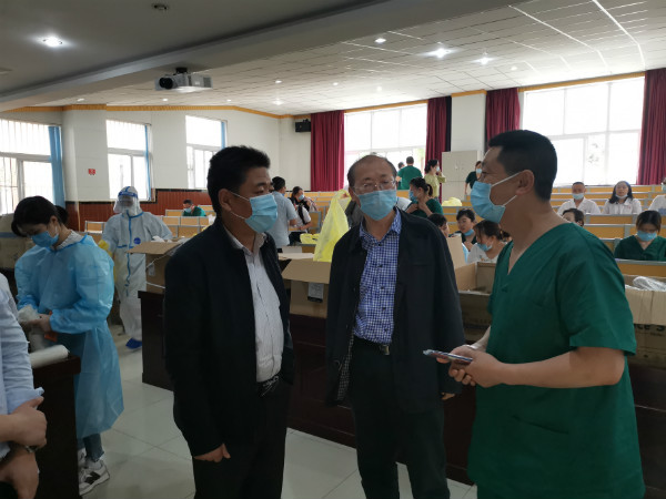 皖西中学校长王建安,校党总支书记、副校长张旭及相关处室、年级部负责人热情迎接医疗队的到来。简短的欢迎仪式后,张校长与医疗队领队胡主任立即协调起二次核酸检测的相关事宜, 50多位医护人员熟练地穿起防护服、仔细地清点检测设备、默契地组成检测小组、快速地投入“战斗”,这一幕幕让在场的人员惊叹宿松县医疗队娴熟的流程和高超的技术。