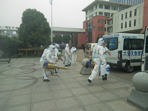 5月23日上午,六安市蓝天救援队十几名志愿者义务为皖西中学开展“全方位、全覆盖、无死角”的校园消毒,助力该校抗疫工作。