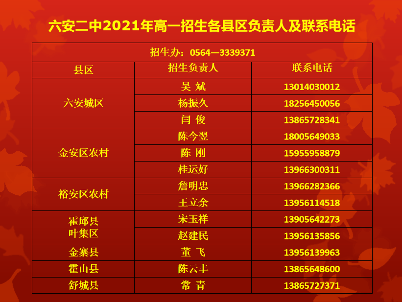 六安二中2021年高一招生各县区负责人及联系电话 编辑:汤晓雪 来源:六安二中 浏览次数: 次 发布时间:2021-06-18 09:35:26 【字体:小 大】 扫一扫在手机打开当前页 【打印正文】 上一篇:皖西中学开展“6.16” 安全宣传咨询日活动 [ 2021-06-18 ] 下一篇:六安二中党委送第八批选派帮扶干部到霍山县漫水河镇平田村任职 [ 2021-06-18 ]
