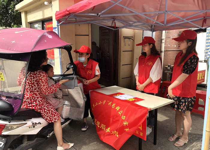 为推动党史学习教育走深走实,7月10日,六安市城北第二小学党支部结合七月份主题党日开展“我为群众办实事”实践活动,围绕“2021级新生入学问题解答”和学生“暑期防溺水安全教育”两方面主题,在学校周边的小区开展志愿者服务活动。
