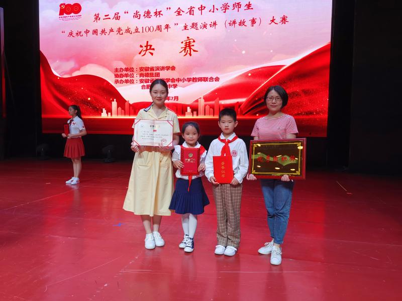 来自全省各地的优秀选手经过市级初赛脱颖而出,来到合肥参加复赛,又经过上午现场激烈角逐,每组三十余名选手中只有五名选手进入决赛并最终决出奖项。六安市皋城小学丛璐老师和一七班吴雯雯同学一路过关斩将最终夺得教师组演讲一等奖和小学组讲故事一等奖,一八班胡睿航同学荣获征文一等奖,以上师生为皋城小学争得了殊荣!组委会还为皋城小学颁发了最佳组织奖,可谓是收获满满,载誉而归!