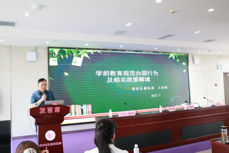 区教体局基教股股长王劲松作题为《学前教育规范办园行为及相关政策解读》的专题讲座,从学前教育发展简史、学前教育相关法律法规、学前教育办学行为规范三个方面,以时间为经,以法律法规、相关制度和相关政策性文件为纬,清晰勾勒出学前教育发展的历史进程,通过对学前教育相关法律法规及规范办学行为等政策性文件的解读,指导参训学员做好依法办园,规范办园行为,促进幼儿全面和谐、 健康发展。