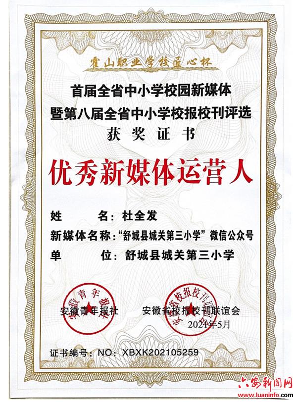 舒城县城关三小教师荣获安徽省首届“优秀校园新媒体运营人”称号
