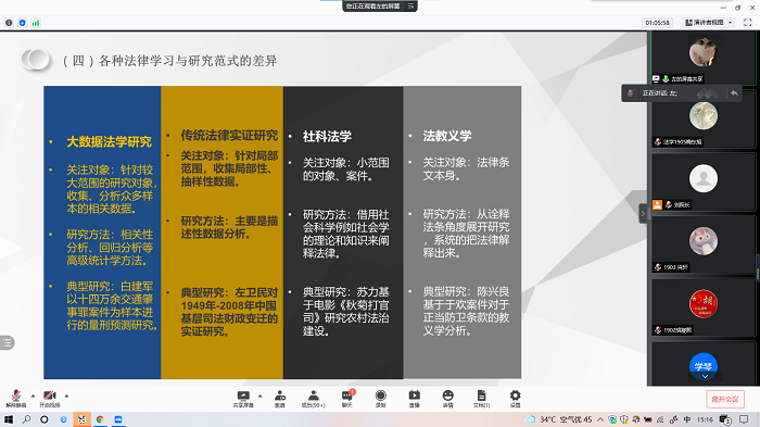 两场报告,内容丰富,数据翔实,理论与实践结合,给师生带来了一场宏大的学术盛宴和精神盛宴。左卫民教授谈吐幽默风趣,分享的信息丰富多彩,分析的视角高瞻远瞩,其渊博的知识和深厚的法学素养令人折服。报告结束后,左卫民教授在线与师生亲切互动,两次报告不仅开阔了师生们的学术视野,更让即将入学的法学院新生们对于深入法学学习与研究更加憧憬与期待。(文/刘凡 图/张贤益 审核/刘鑫)
