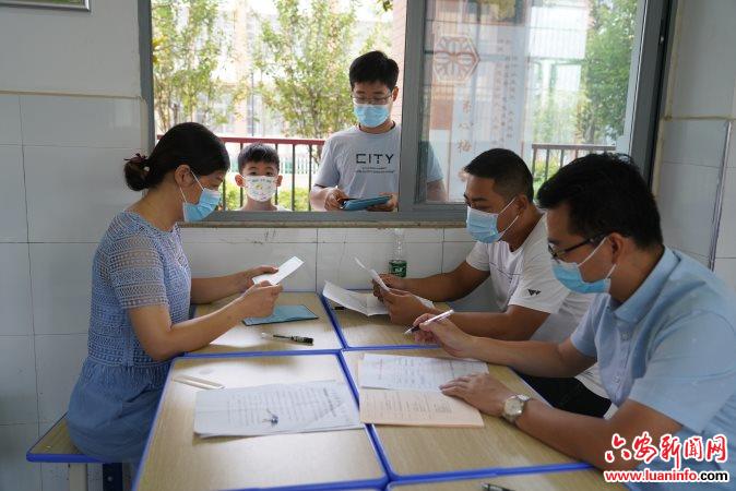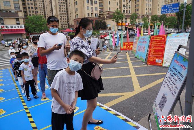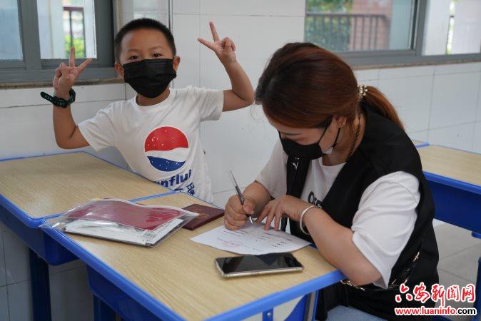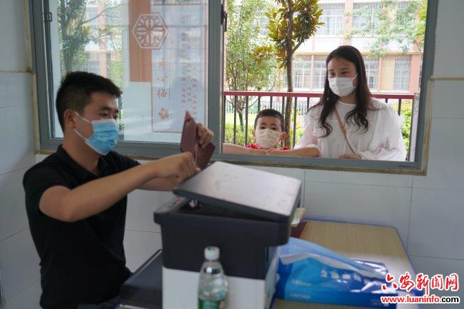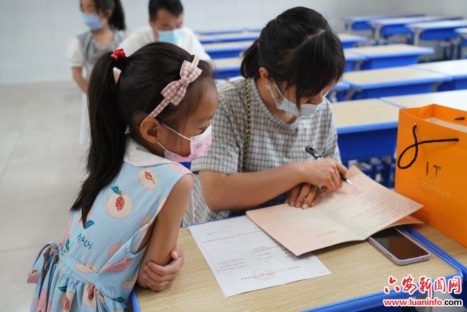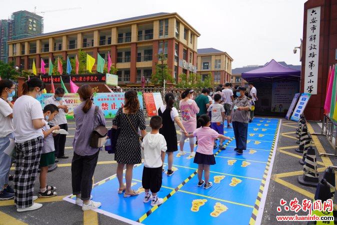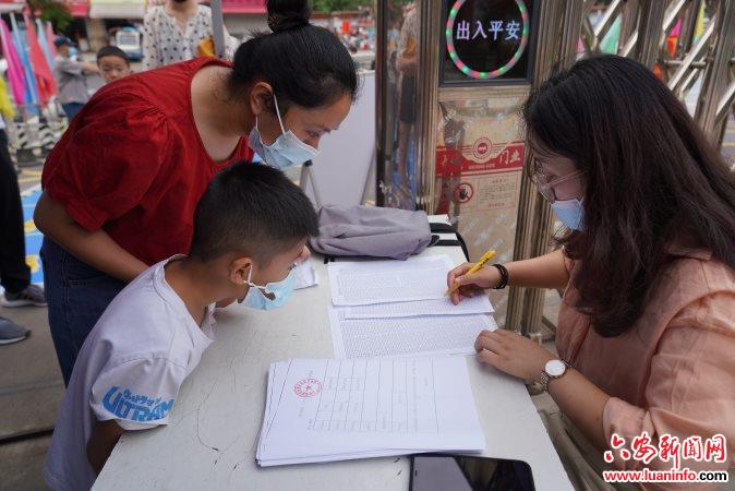 “您好,这位家长,请扫码出示健康码,我给您测个体温,这边签字登记一下。”8月20日,六安市解放路第三小学迎来了第一批一年级新生资料审核的家长和小朋友。所有家长按照手机上的进校时段有序排队验证入场,新生家长在学校老师的引导下顺利完成现场提交材料审核。