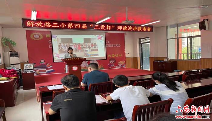首先举行的是解放路第三小学第四届“三爱杯”师德演讲报告会,夏清,叶守群,王玮三位年轻教师,通过层层选拔,作为优秀教师代表参与演讲。三位教师或从教育教学中亲身经历的真人真事及身边典型教师的先进事迹为题材;或结合自己教育教学的亲身经历和感受,畅谈了对教育事业的忠诚和责任,讲述了对学生的热爱、关心和帮助。她们分别从不同的角度阐述了对师德师风的理解,既有真情实感,又有理性思考,她们的演讲激情洋溢,平凡中彰显着伟大,充分展示教师严谨治学、潜心教研、关爱学生成长的责任心和使命感。三位教师情感真挚、声情并茂的演讲获得了台下教师的阵阵掌声。