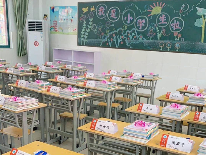 教室里,老师提前用红丝带将新书包成了一份份可爱的礼物,放在整洁的书桌上,等待着孩子们的到来。