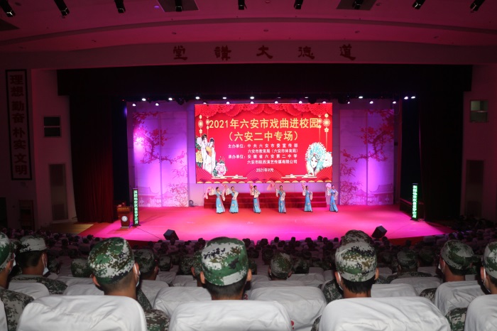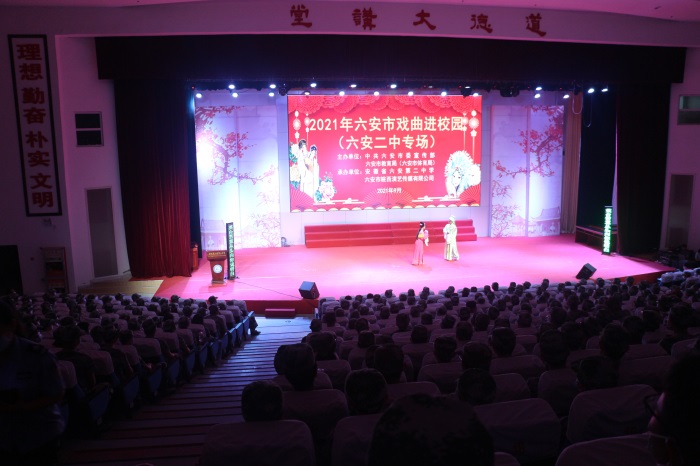 为进一步丰富校园文化生活,传承中华优秀传统文化,引导青少年增强文化自信,2021年9月23日晚,六安市皖西演艺公司和六安二中在海峰堂报告厅联合承办了“戏曲进校园”活动。校长关世宏,德育处、高一年级部主任,部分班主任以及近千名高一学生观看了演出活动。