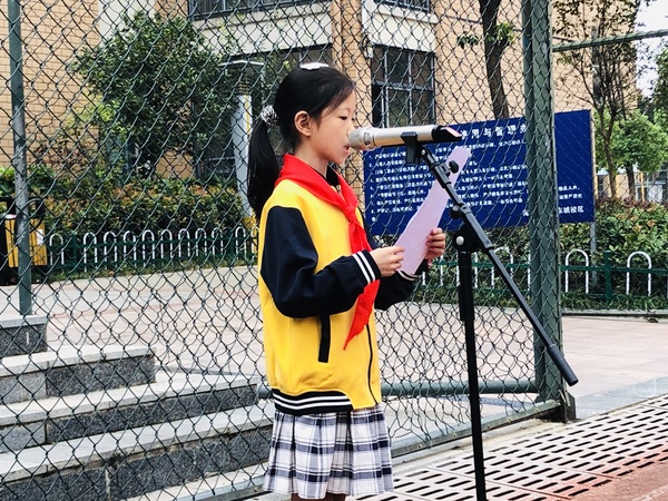 本周晨会的主题是“校园文明礼仪”。在飘扬的国旗下,四(1)班的吴怡涵作了国旗下讲话。她演讲的题目是《文明礼仪在校园》。