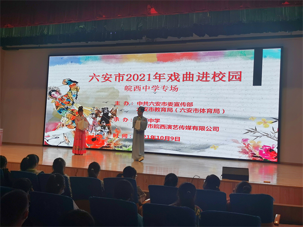 为进一步加强未成年人思想道德建设,弘扬和传承中华优秀传统文化,引导中学生增强文化自信,让学生近距离接触和了解戏曲文化,2021年10月9日下午,六安市皖西演艺公司和皖西中学在学校学术报告厅联合承办了“戏曲进校园”活动。党总支书记张旭、校办室主任吕丹、政教处主任梁泽明、高一年级部主任张锐以及近千名高一师生观看了一场精彩绝伦的演出活动。