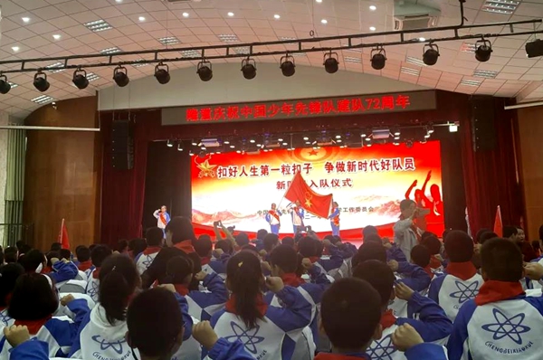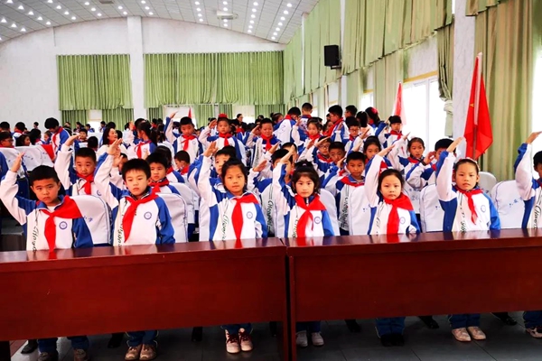 校领导勉励全体少先队员要在星星火炬的指引下努力学习,用自己的实际行动为队旗增光添彩,做一名有理想、有道德、有纪律、有文化的共产主义事业接班人。最后,全体少先队员面对鲜红的队旗,高举右拳在大队辅导员的带领下庄严呼号:“准备着为共产主义事业而奋斗!”“时刻准备着!”