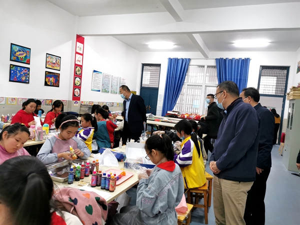 胡雪松详细询问了学生参与个性化课程的感受,实地察看了校园文化氛围、环境卫生和个性化课程教学情况。在扎染教室里,胡雪松一行还饶有兴致地观看孩子们学习扎染的过程,并与授课老师进行了亲切交流。