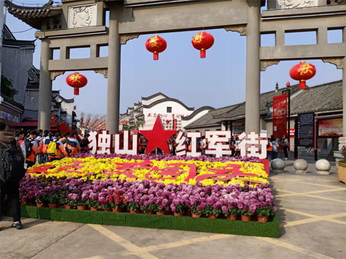 车辆抵达独山苏维埃城后,孩子们迫不及待地跳下车,飞向了古风徽韵的红军大街。大家在老师们的带领下,穿行在灰砖青瓦、飞檐翘角、雕梁画栋的古民居建筑间,参观了独山革命旧址群。孩子们,一路行走,东张西望,指指点点,惊叹不已。随着导游老师,大家怀着无比崇敬的心情,步入六霍起义纪念馆,瞻仰了革命烈士的史料遗物,详细了解了将军镇那段血雨悲歌的峥嵘岁月,缅怀了革命先辈的丰功伟绩。从纪念馆出来,大家拾级而上,来到了六霍起义纪念塔前。苍松静穆,鲜花含情。孩子们肃立在巍峨的纪念碑前,向革命英烈们默哀致敬。大家站在鲜红的队旗下,重温入队誓词,纷纷合影留念。