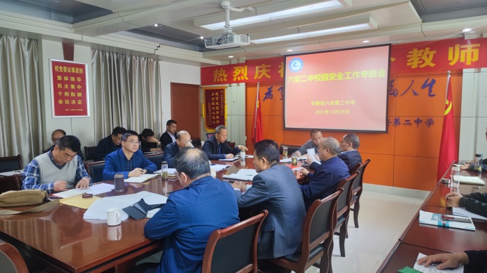 10月29日下午,六安二中在综合楼九楼第一会议室召开校园安全工作专题会。校领导班子全体成员,各处室、各年级部负责同志,各党总支、老校区各支部书记参加会议。会议由党委书记、校长关世宏主持。